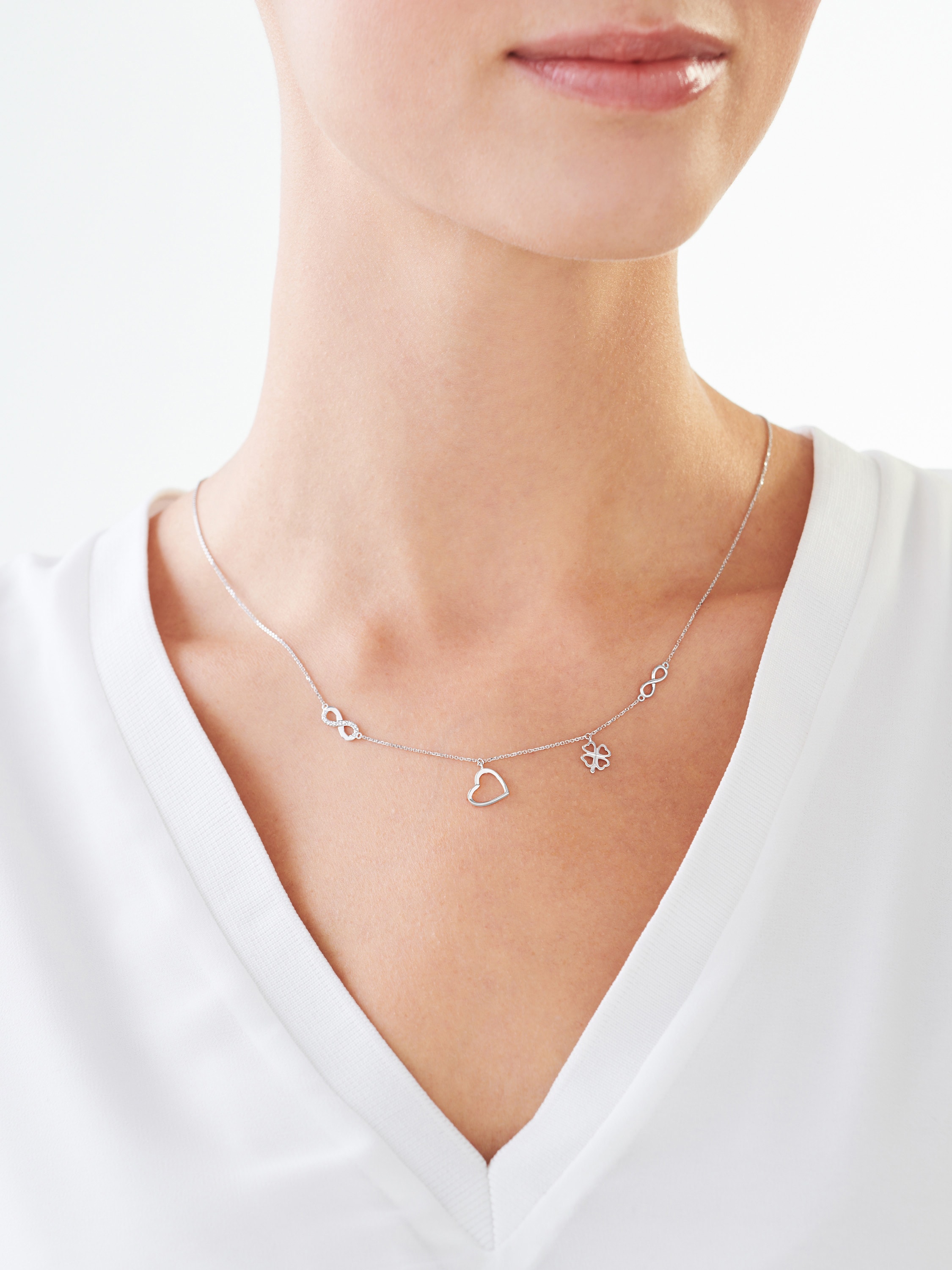 Náhrdelník z bílého a růžového zlata s diamanty - srdce, nekonečno, čtyřlístek - 0,01 ct - ryzost 585