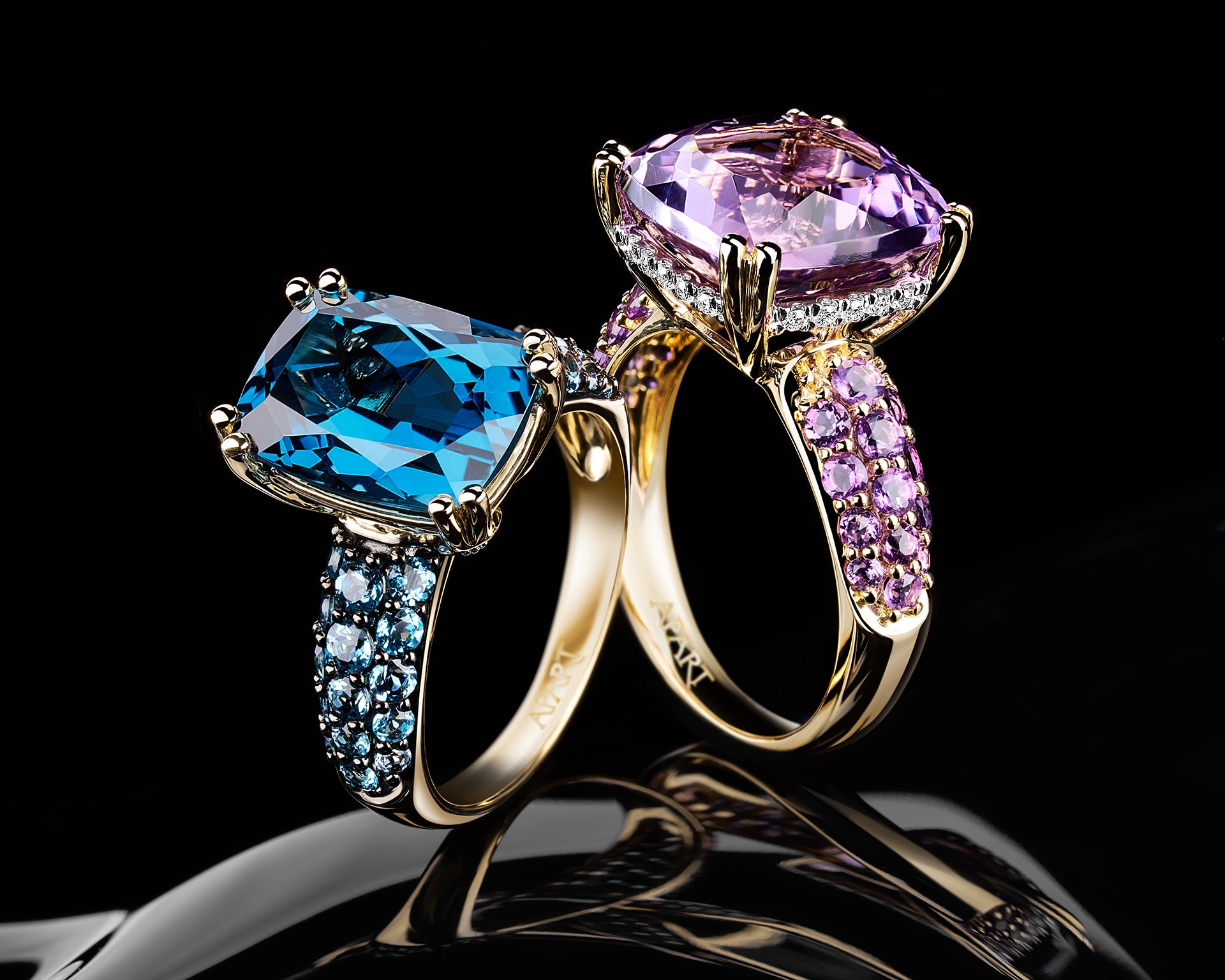 Fotografie nemusí odpovídat skutečným odstínům ametystů v jednotlivých prstenech.